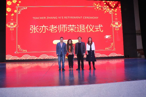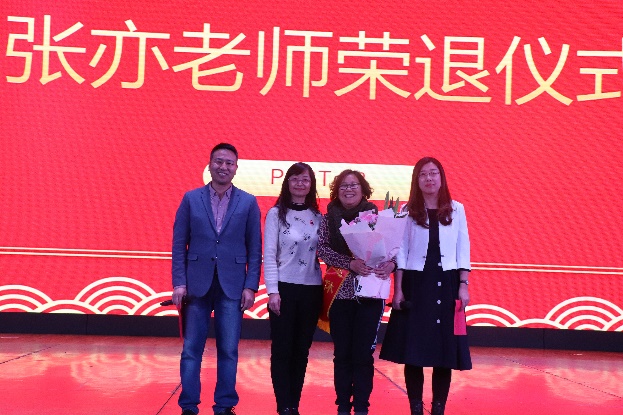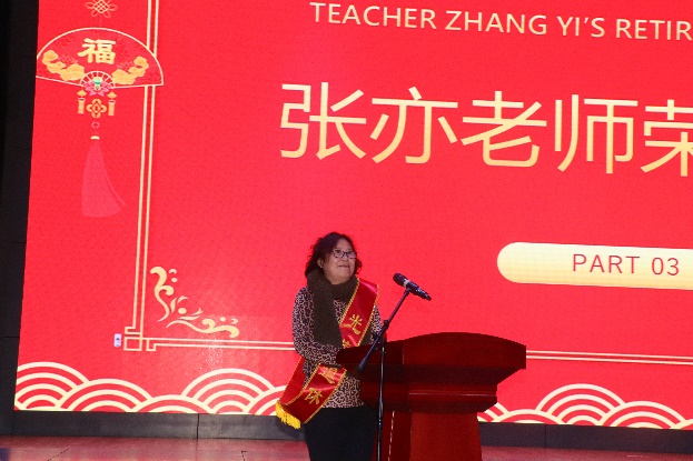 其次举行盛大的荣退仪式。仪式共分四个阶段。首先是邀请张亦老师上台一同观看分工会制作的短视频。伴随着音乐“不说再见-物电学院”响起,一幅幅张亦老师和大家共事的照片映入眼帘,勾起了我们诸多美好的回忆。进入仪式第二阶段,马瑜书记为张亦老师佩戴绥带并致辞。绶带上的“光荣退休”四个字格外显眼,这是对张亦老师辛勤工作四十余载最高的褒奖。马书记回顾了与张老师共事期间的点点滴滴,幽默风趣的讲话引起现场掌声此起彼伏。仪式第三项是物理系主任郝睿教授为张亦老师献花并致辞。一束鲜花生机勃勃,既是对张亦老师活泼性格的诠释,更是寓意张亦老师退而不休,焕发新的活力。郝睿老师的致辞没有太多华丽的辞藻,但每一句都道出了我们物电人发自内心的感谢和不舍。仪式的最后一个阶段是张亦老师发表荣退感言。张亦老师有太多的话语和感言要和大家分享,然而她眼眶湿润,几近哽咽,仅用几句深情的感谢和两次鞠躬表达了内心由衷的谢意。