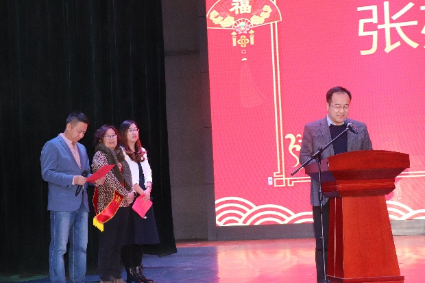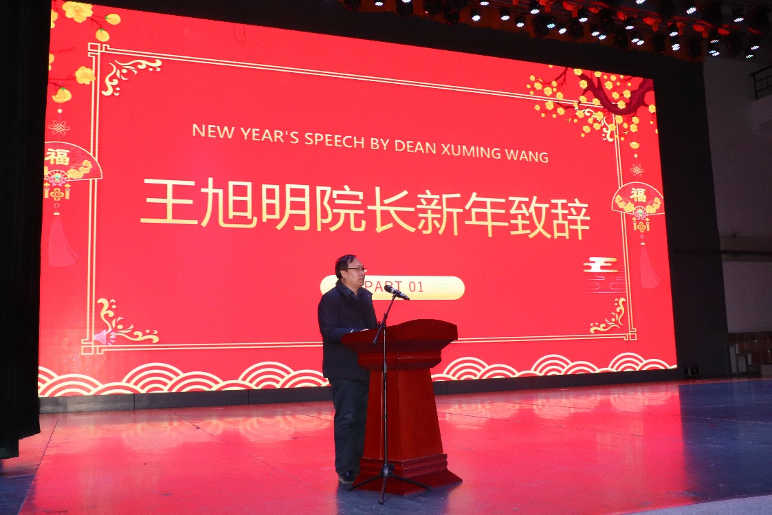 首先王旭明院长代表学院党政领导致新年贺辞。王院长回顾了学院一年来取得的骄人成绩,肯定了所有教职员工的辛勤付出,最后为大家送上了新年祝福。