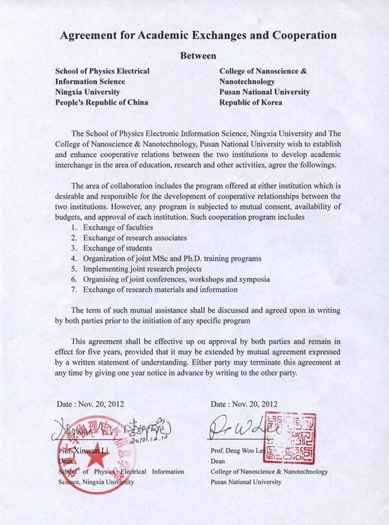 bet365体育 物理电气信息学院与韩国釜山大学纳米科学与纳米技术学院于2012年12月12日正式签署学术交流与合作协议。此次合作共计5年,生效日期自2012年12月12日至2017年12月12日。