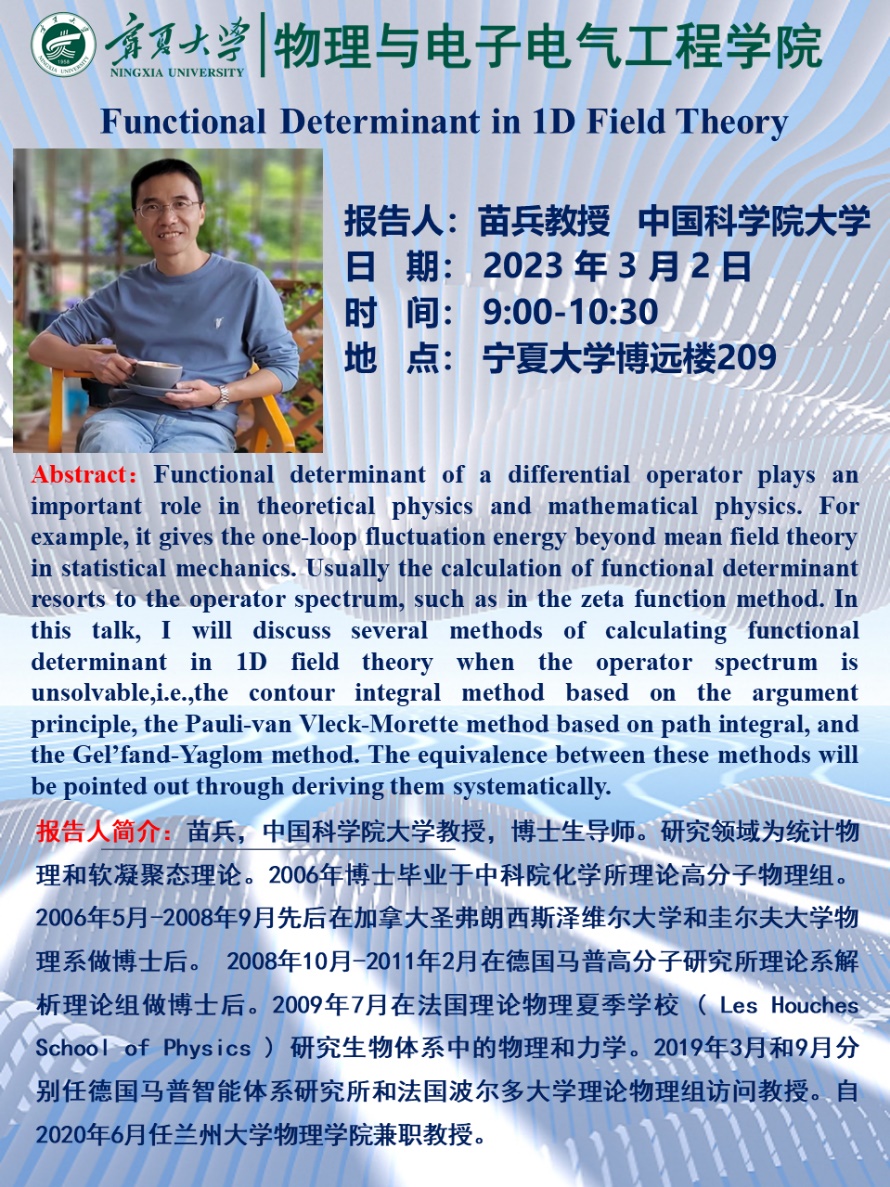 报告人简介:苗兵,中国科学院大学教授,博士生导师。研究领域为统计物理和软凝聚态理论。2006年博士毕业于中科院化学所理论高分子物理组。2006年5月-2008年9月先后在加拿大圣弗朗西斯泽维尔大学和圭尔夫大学物理系做博士后。2008年10月-2011年2月在德国马普高分子研究所理论系解析理论组做博士后。2009年7月在法国理论物理夏季学校( Les Houches School of Physics )研究生物体系中的物理和力学。2019年3月和9月分别任德国马普智能体系研究所和法国波尔多大学理论物理组访问教授。自2020年6月任兰州大学bet365体育 兼职教授。