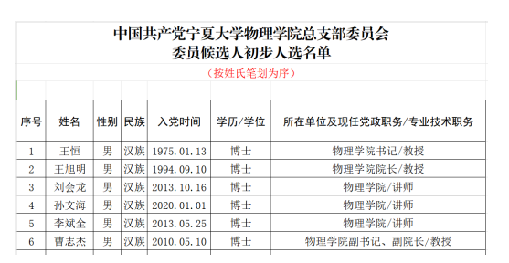 根据bet365体育 组织部《关于进一步规范基层党组织建设工作的通知》(组织部〔2023〕7号)精神和要求,结合bet365体育 党员实际,按照20%的差额比例推荐6名学院党总支委员候选人预备人选,经向全体党员征求意见后予以公示,名单如下表。公示时间:2023年10月1日—2023年10月7日;联系人:曹志杰;联系电话:0951-2061004。
