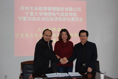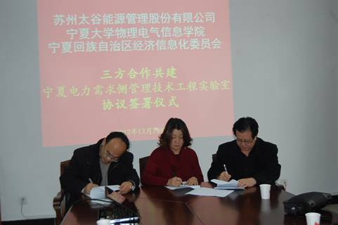 2012年12月25日下午,苏州太谷能源管理股份有限公司董事长曹萍女士、宁夏回族自治区经济信息化委员会电力处闫学忠处长、bet365体育 物理电气信息学院李新碗院长在bet365体育 208会议室共同出席并签署由苏州太谷能源管理股份有限公司、bet365体育 物理电气信息学院、宁夏回族自治区经济信息化委员会电能服务中心三方共同建设宁夏电力需求侧管理技术工程实验室合作协议。