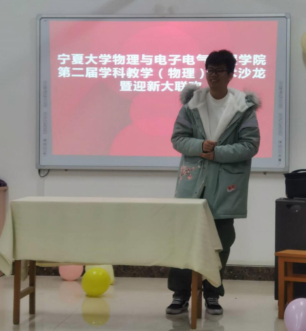 为促进研究生科研成果交流,拓展研究生的学术视野,2020年12月24日,物理与电子电气工程学院学科教学(物理)专业“学术沙龙暨迎新大联欢”在贺兰山校区致知楼成功举办。张轶炳、杨晓梅、郝睿等学位点的全体师生参加。