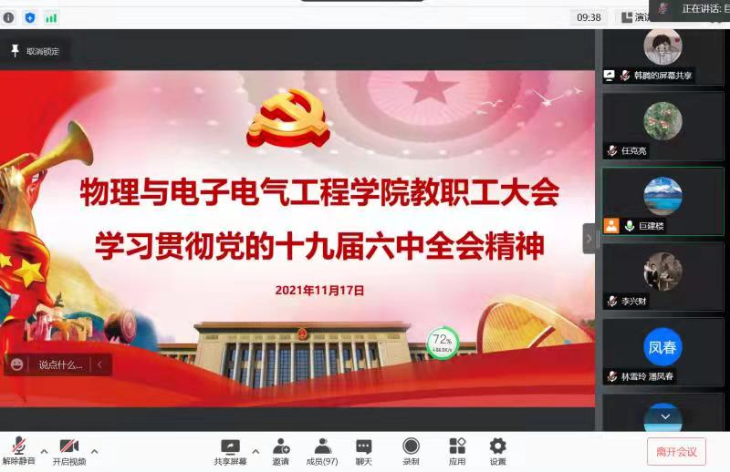 中国共产党第十九届中央委员会第六次全体会议于2021年11月8日至11日在北京举行。物理与电子电气工程学院党委第一时间组织师生收看全会精神解读新闻发布会,会后在线上采取了党委理论学习中心组集体学习讨论、各党支部召开专题学习讨论会、召开全院教职工大会学习等多种形式贯彻会议精神,在师生中产生了热烈讨论和积极反响。