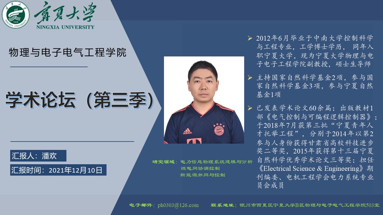 “物电学术论坛”第三季于2021年12月10日下午2:30在学院206室进行,学院邀请潘欢副教授做学术报告。