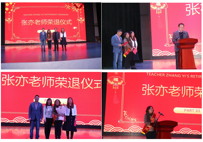 接下来,为今年退休的张亦老师举行了盛大的荣退仪式。仪式共分四个阶段。首先,邀请张亦老师同台观看分工会精心制作的短视频。伴随着 “不说再见-物电学院”熟悉音律的响起,一幅幅张亦老师和大家共事的照片映入眼帘,勾起了老师们诸多美好的回忆;仪式第二项,马瑜书记为张亦老师佩戴绥带并致辞。绶带上的“光荣退休”四个字格外耀眼,这是对张亦老师辛勤工作四十余载的最高褒奖;马书记悉数与张老师共事期间的点点滴滴,幽默风趣的讲话激起了在场教师们的深刻共鸣,现场掌声此起彼伏;仪式第三项,物理系主任郝睿教授为张亦老师献花并致辞。美丽的鲜花生机盎然,既是对张亦老师爽朗直率性格的诠释,更是寓意张亦老师退而不休,继续焕发新生活力;郝睿老师的致辞没有太多华丽的辞藻,但每一句都道出了我们物电人对张老师发自内心的感谢和恋恋不舍;仪式最后一项,张亦老师发表荣退感言。张亦老师激动不已、眼眶湿润、几近哽咽,仅用几句深情的感谢和两次深深的鞠躬表达了内心由衷的谢意。