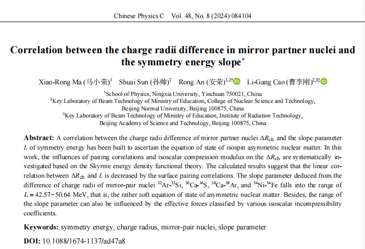 6月13日,bet365体育 本科生马小荣(学号:12020241869)与北京师范大学博士研究生孙帅、bet365体育 安荣博士以及北京师范大学曹李刚教授,在国际学术期刊《Chinese Physics C》上发表题为“Correlation between the charge radii difference in mirror partner nuclei and the symmetry energy slope”的原创论文。文章研究了对关联以及对称核物质不可压缩系数对镜像核电荷半径差值与对称能斜率之间关联性的影响,发现表面对相互作用以及不同的压缩模式都会影响镜像核电荷半径差值与对称能斜率之间的关联性。马小荣为该论文的第一作者,安荣博士为该论文的第一通讯作者,bet365体育 为该论文的第一通讯单位。