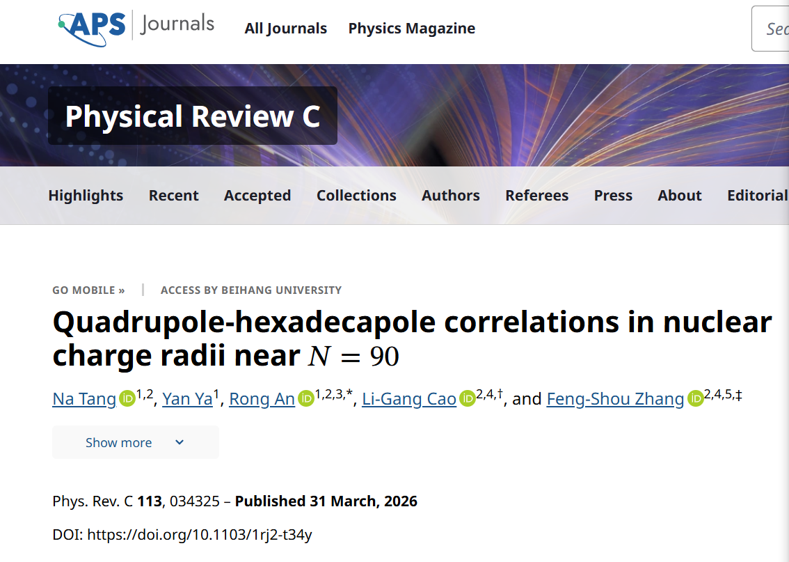 2026年3月31日,bet365体育 理论物理组青年教师唐娜博士和安荣博士与北京师范大学曹李刚教授和张丰收教授,在美国物理学会权威期刊《Physical Review C》上发表题为《Quadrupole-hexadecapole correlations in nuclear charge radii near N = 90》的原创性论文。文章通过同时约束四极形变和十六极形变的方法,系统描述了中子数N=90附近原子核电荷半径的演化趋势。文中指出,在N=90处原子核电荷半径会发生形状相变,同时四极矩和十六极矩之间的强耦合行为也会影响电荷半径的数值大小。唐娜博士是该论文的第一作者,2024级硕士研究生雅燕(学号:12024130700)为该论文的第二作者,安荣博士是该论文的第一通讯作者,bet365体育 为该论文的第一完成单位。