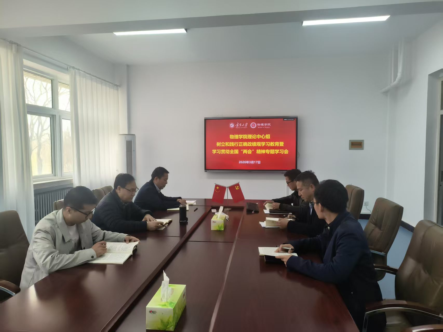 会议首先学习习近平总书记关于树立和践行正确政绩观的重要论述,解读核心内涵,强调领导干部要坚守党性原则,以实干回应师生期待,杜绝急功近利,助力学院发展。随后,集中学习2026年全国两会精神,重点传达习近平总书记两会期间重要讲话精神,解读政府工作报告中教育、科技、人才一体化发展部署,要求全院将思想和行动统一到中央决策部署,融入教育强国建设大局。最后,学院党总支书记王恒作总结,明确三点要求:一是持续深化理论学习,通过多种形式推动学习走深走实;二是坚持学用结合,将学习成果融入学科建设、人才培养等各项工作;三是强化责任担当,带领全院师生为学校“双一流”建设和物理学科高质量发展贡献力量。