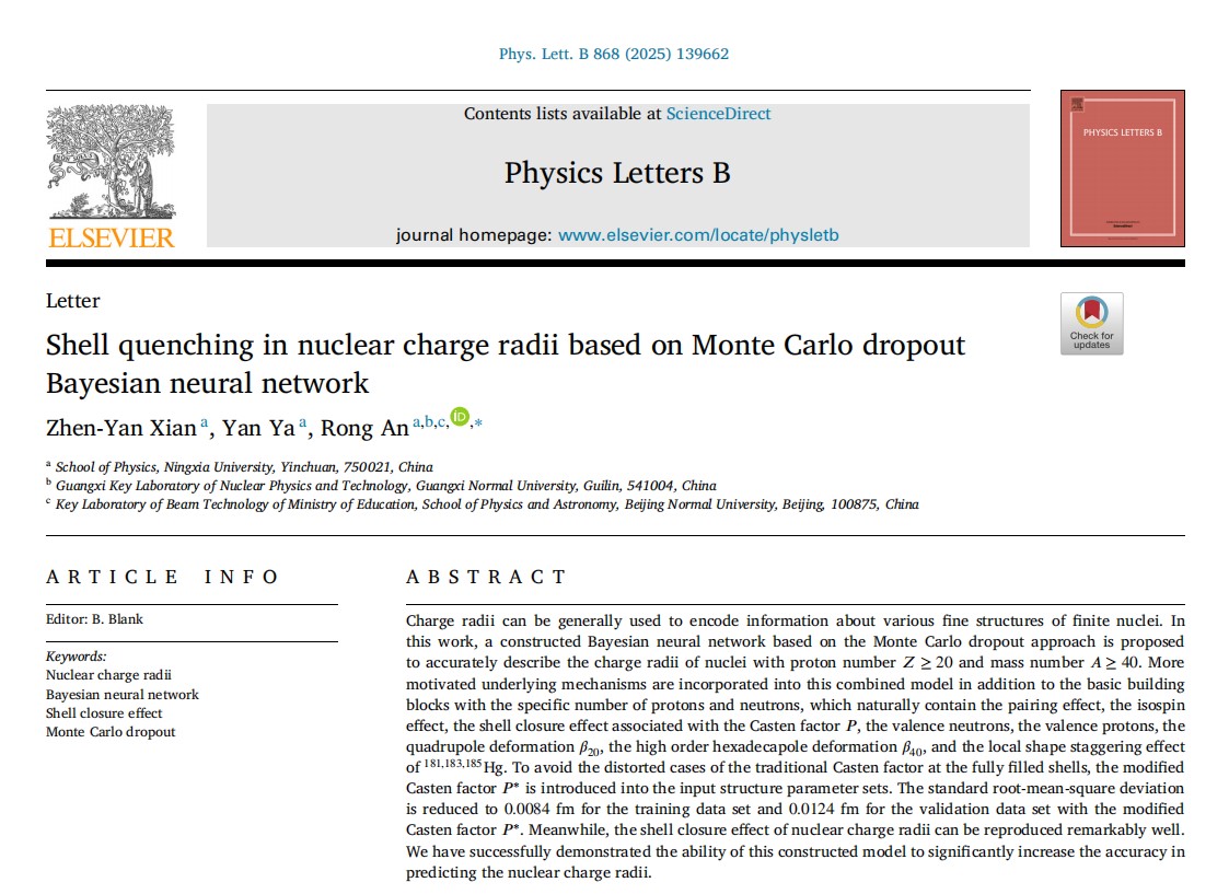 2025年6月17日,国际著名核物理期刊《Physics Letters B》在线发表了题为《Shell quenching in nuclear charge radii based on Monte Carlo dropout Bayesian neural network》的论文。该论文的第一作者为bet365体育 本科生冼振谚(学号:12023243826),第二作者为bet365体育 硕士研究生雅燕,bet365体育 安荣博士为唯一通讯作者,bet365体育 为该论文的第一通讯单位。该杂志出版国家为荷兰,出版商为Elsevier,JCR分区为Q1,中科院大类分区为2区,小类核物理分区为1区,文章以Letter形式发表。2024年诺贝尔物理学奖授予美国科学家约翰·霍普菲尔德(John J. Hopfield)和英裔加拿大科学家杰弗里·辛顿(Geoffrey E. Hinton),以表彰他们通过人工神经网络实现机器学习而作出的基础性发现和发明。人工智能机器学习方法在核物理学科中得到了广泛的应用,例如预测原子核的质量、原子核的衰变性质以及低激发态性质,原子核反应中的产物截面以及原子核的尺寸大小等。该文章基于Monte Carlo dropout贝叶斯神经网络方法,在输入层结构中考虑了价核子,Casten因子以及形变的影响,系统地研究了电荷半径的演化趋势。研究发现,通过改进的Casten因子可以很好地再现电荷半径的壳效应,并进一步提高了模型的外推能力。该研究结果对于理论模型的发展以及实验探测都具有重要的参考价值。该论文是我校首篇发表在《Physics Letters B》上的学术成果,是我校“双一流”建设的一项重要...