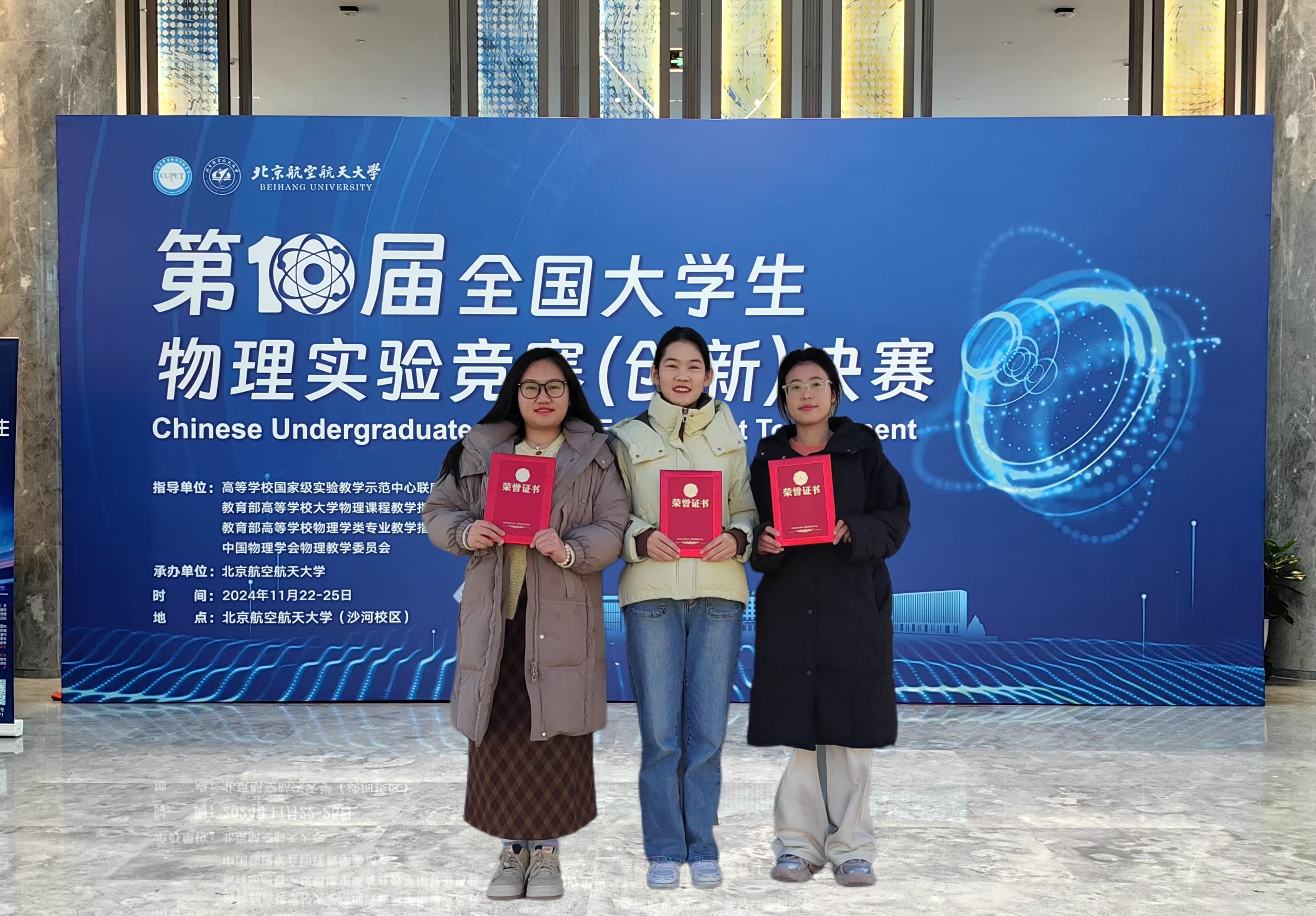 11月22日-25日,第十届全国大学生物理实验竞赛(创新)决赛在北京航空航天大学隆重举行。bet365体育 学生代表队通过校赛、西北赛、国赛预选的层层选拔,在决赛中最终斩获国赛一等奖1项,二等奖1项,优秀奖3项和优秀组织奖。这是我校在该竞赛中获得的第一个国家级一等奖。本次大赛参赛规模和影响力再创新高。经过激烈的角逐,由bet365体育 马玲教授指导的殷璇(bet365体育 )等3名学生组成的团队凭借对物理实验的深刻理解和出色的临场表现,在决赛现场脱颖而出,荣获讲课类项目最高奖项。全国大学生物理实验竞赛(创新)始于2010年,于2020年入选全国普通高校大学生竞赛排行榜,该赛事是进入该排行榜的唯一物理类竞赛项目(A类),在大学生课外科技竞赛领域具有广泛的影响力,其宗旨是激发大学生对大学物理实验课程的兴趣与潜能,培养大学生创新能力、实践能力和团队协作意识。bet365体育 积极组织教学经验丰富的教师指导本科生物理实验能力培养和创新,通过梯次培养,形成团队优势。此次斩获多项竞赛奖项是师生共同努力和辛勤付出回馈,是学院重视“以本为本”理念,增强本科生专业能力建设工作的有效体现
